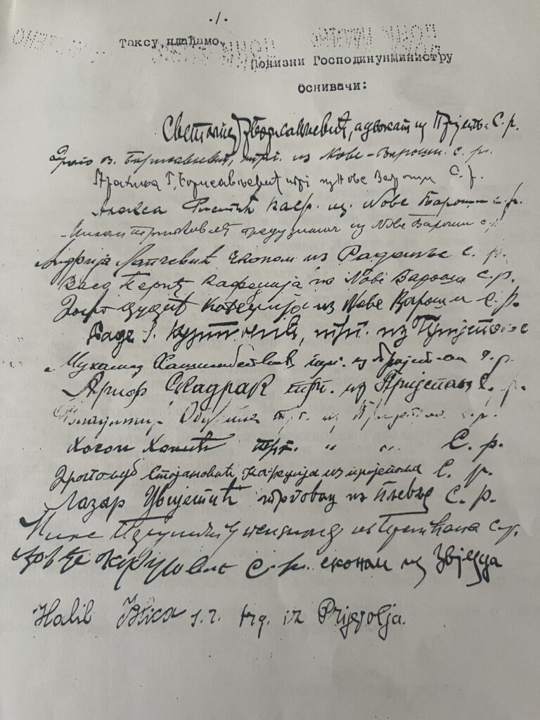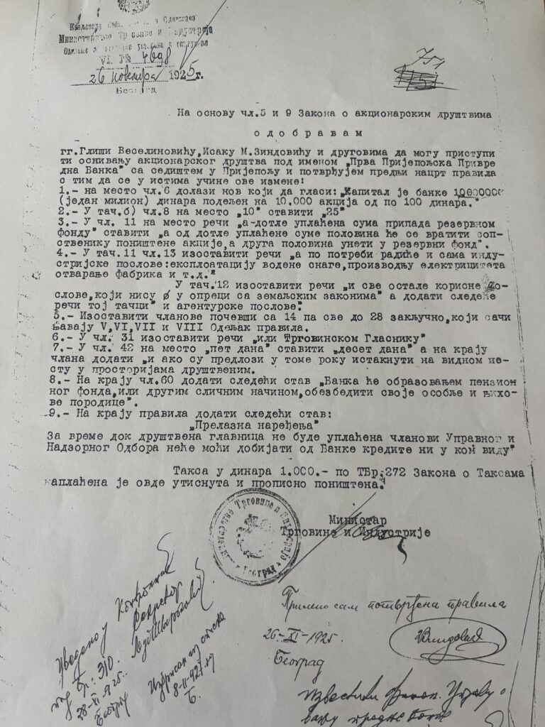 Они су 19. октобра 1925. године послали молбу Министарству да им одобри оснивање акционарског друштва под називом ,,Прва Пријепољска Привредна банка” и актом број ВИ Н 4698 од 26. новембра Министарство је одобрило оснивање уз одређене, безначајне измене Правила.Међутим, пошто оснивачи, из непознатих разлога, нису одржали Оснивачки збор у заказаном року од годину дана, Министарство их је избрисало са списка акционарсих друштава.