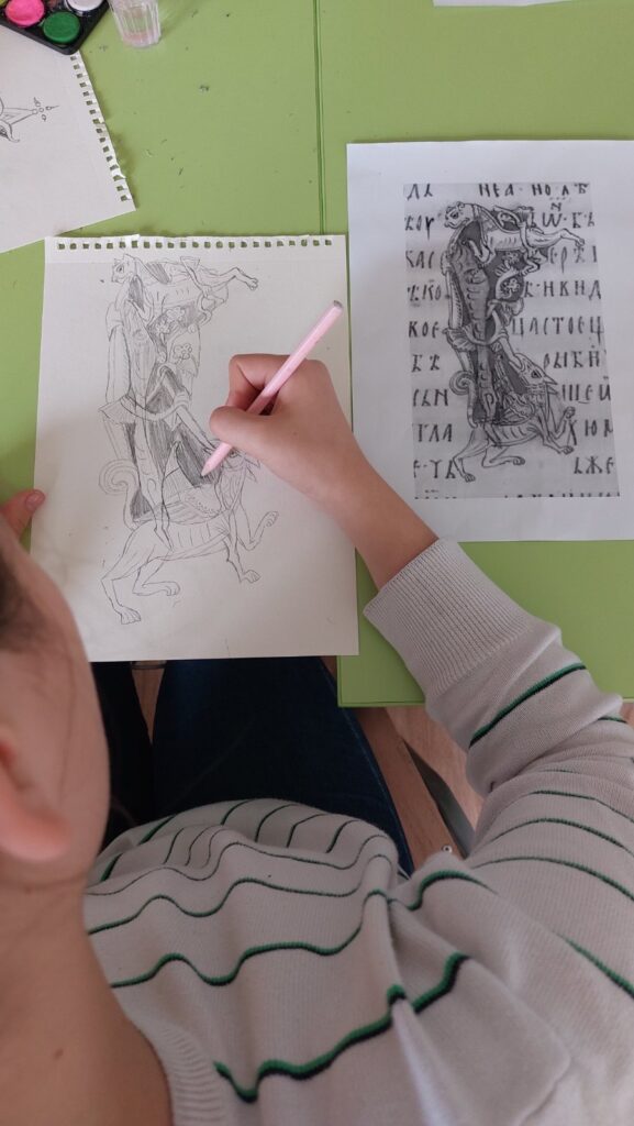 „Полазници ће се упознати са основама краснописа, прибором, материјалима, техникама, правилима, покретима, као и правилним држањем тела, руке и пера. Учиће и о украсима – бојама, орнаментима и иницијалима. Поред тога, стећи ће увид у историју језика и писма и развој српског језика. Имаће прилику да виде најстарије списе и споменике, изглед обле и угласте глагољице, устава, полуустава и ћириличног курзива, као и разноврсне фонтове ћириличног и латиничног писма.Кроз практичан рад развијаће осећај за симетрију, прецизност и естетику, а овладаће и исписивањем и украшавањем својих првих калиграфских радова, што је најлепши део овог процеса.Калиграфија није само вештина лепог писања, већ и вид опуштања и начин да се развију стрпљење и фокус. У времену брзине и свакодневних изазова, краснопис пружа прилику да застанемо, направимо предах, уживамо и стварамо. Сваки рад носи лични печат аутора, што доприноси посебном задовољству. Досадашње искуство показало је да полазници тешко напуштају часове и са нестрпљењем ишчекују наредни. Верујте, на овим часовима је право уживање!